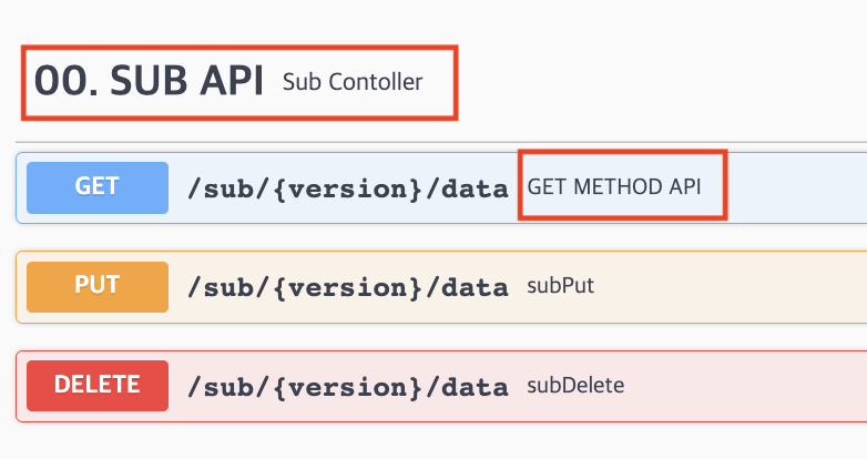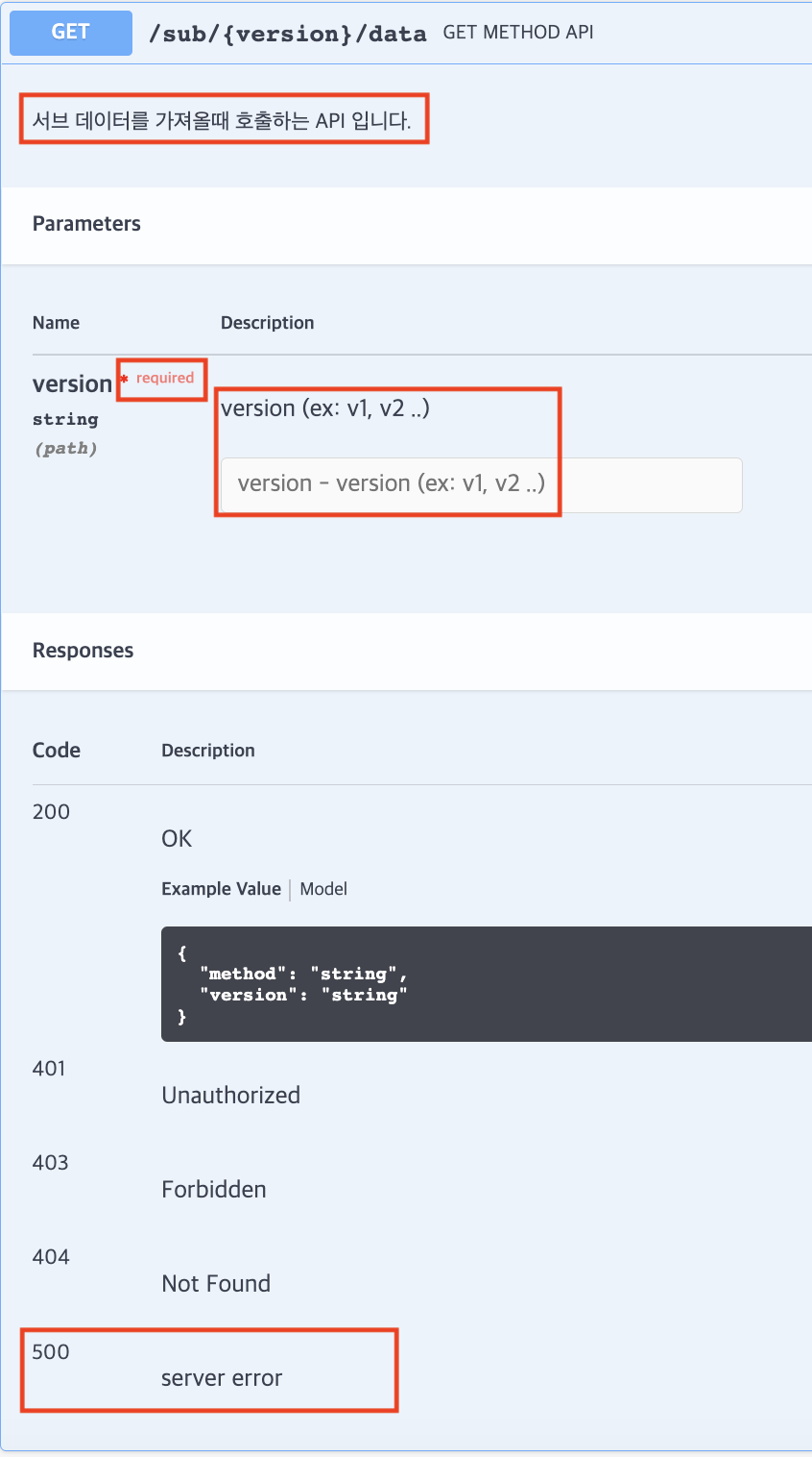 @ApiOperation(value = "GET METHOD API", notes = "서브 데이터를 가져올때 호출하는 API 입니다.")