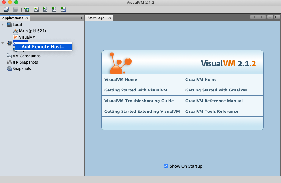설정 하여 프로세스를 기동 하였으면 visualVm을 실행 시키고 remote 에서 오른쪽 마우스를 클릭후 add remote host 를 클릭한다.