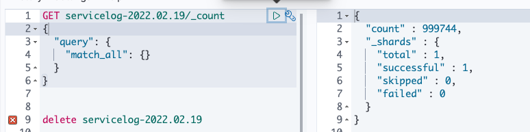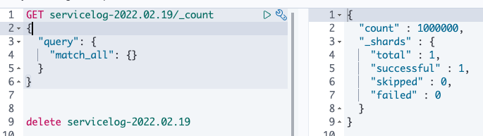 # 로그 건수 확인 GET servicelog-2022.02.20/_count { "query": { "match_all": {} } } { "count" : 12, "_shards" : { "total" : 1, "successful" : 1, "skipped" : 0, "failed" : 0 } } # 로그 데이터별 건수..