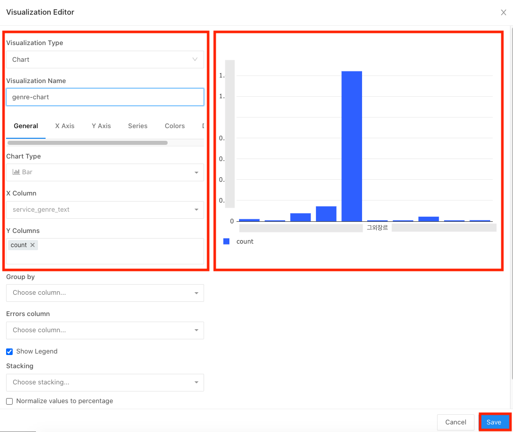 아래와 같이 원하는 그래프 유형, 이름, x 축, y축 데이터 선택하면 오른쪽 화면에 미리보기로 볼 수 있다.