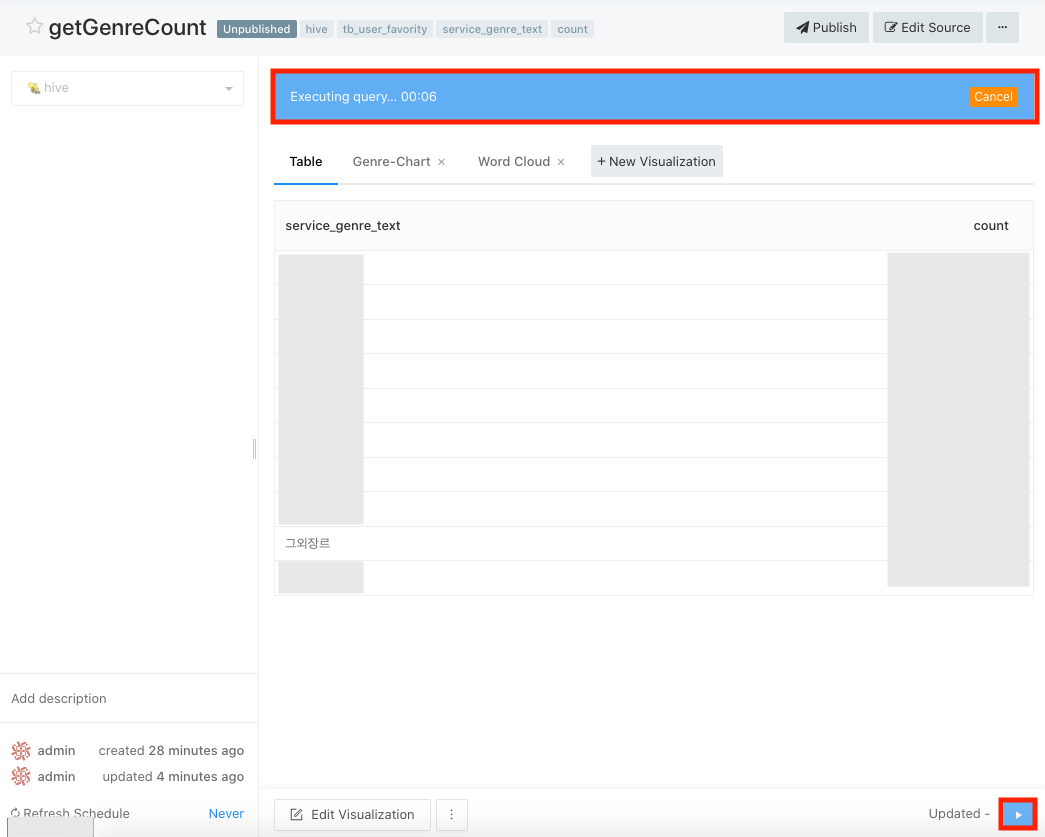 쿼리 실행이 완료 되면 새 데이터로 갱신된다.