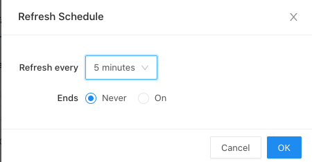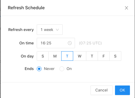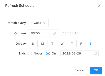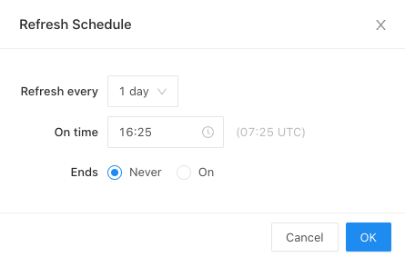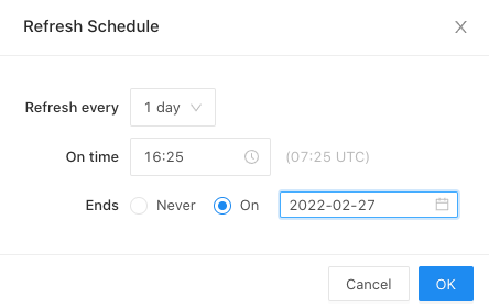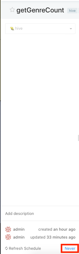일별 스케쥴링 하게되면 해당 쿼리가 실행될 시간을 선택하는 박스가 추가로 나오며 (만약 설정한 시간이 현재 시간 이전이면 오늘 부터 쿼리가 실행 된다.)