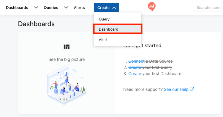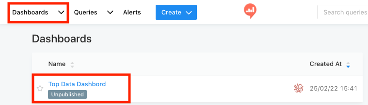 redash 를 접속하여 Create > Dashbord 를 클릭한다.