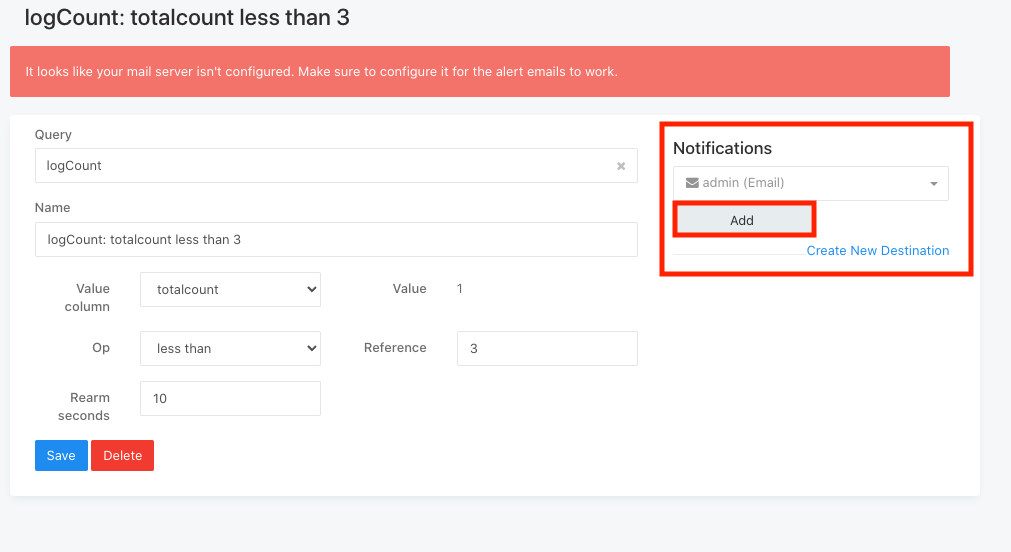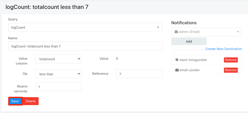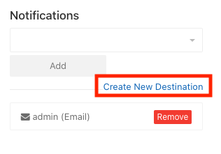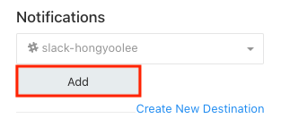 Save 하면 왼쪽에 알람 대상자를 선정할 수 있으며 slack 을 선택할 것이기에 'create new destination' 을 눌러 추가하기로 한다.