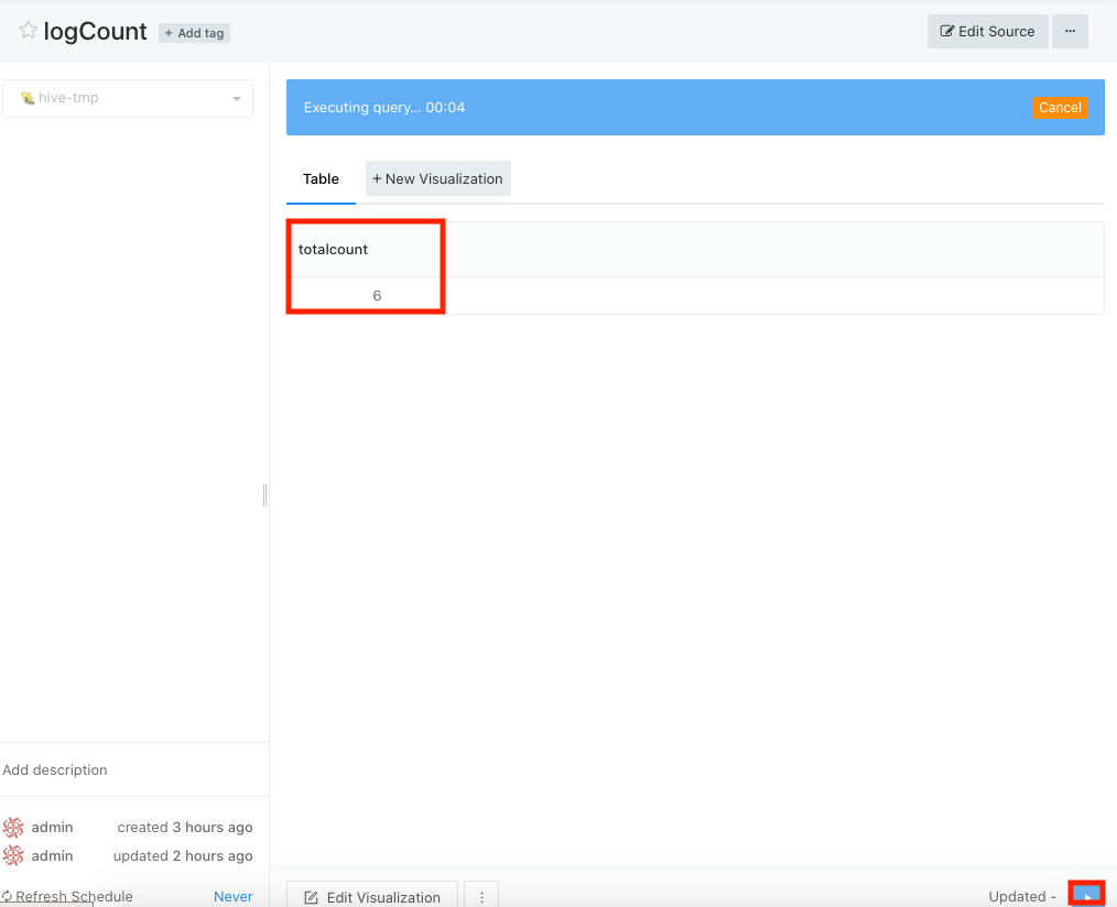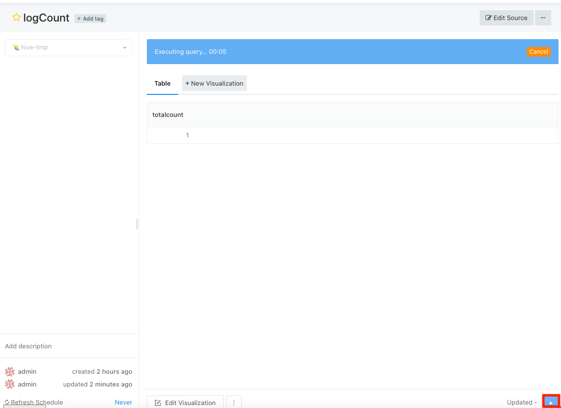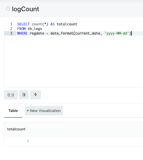 우선 오늘 날짜 로그 수를 카운팅하는 쿼리를 작성한다.
