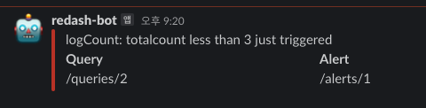 총 데이터 건수가 1건 이기에 '3건 이하' 라는 경고 조건에 해당 하기에 slack 알람이 온다.