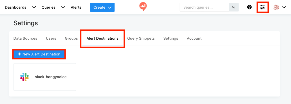 redash 페이지를 접속한뒤 Create > Alert 를 클릭한다.